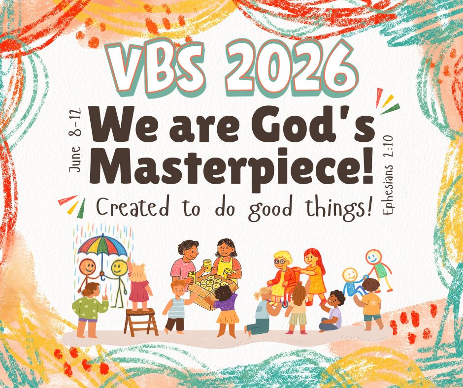 VBS is available for children ages 3 (must be potty-trained) through incoming 3rd grade in fall of 2026. We have developed our own curriculum based off of the Scripture Ephesians 2:10: